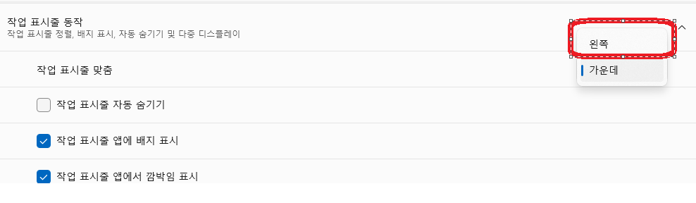 3. [작업 표시줄 맞춤] 메뉴에서 [가운데]를 [왼쪽]으로 변경