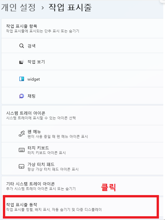 1. 작업표시줄에서 오른쪽 클릭 하면 [작업표시줄 설정] 이 나옵니다. [작업표시줄 설정] 클릭