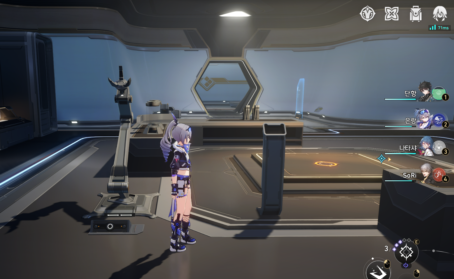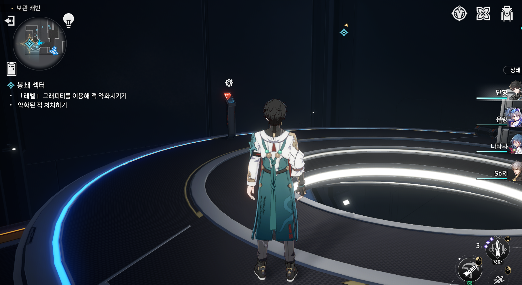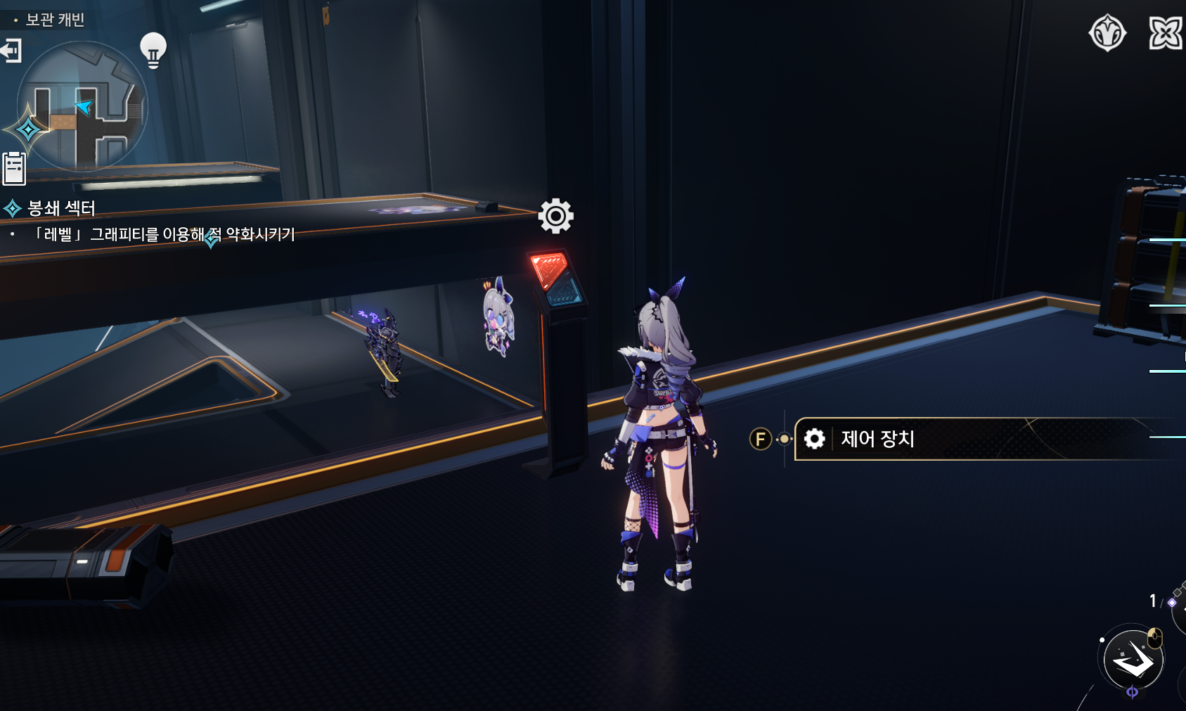 주황색다리를 건너고 제어장치를 누르면 투명색 다리가 생기는데, 그곳을 건너 바닥의 은랑 그래피티를 스캔해 줍니다. 은랑 그래피티를 스캔 후 다시 제어장치를 누르면 파란색 다리가 생기고 보스방으로 가는 루트가 완성됩니다.