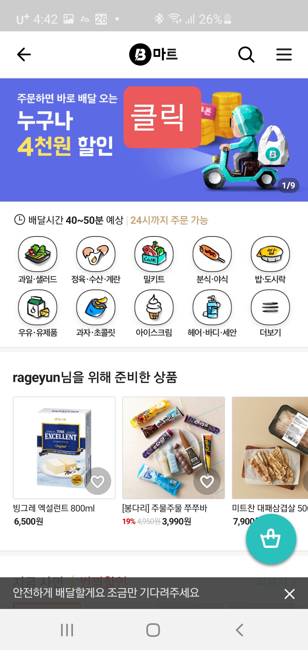 먼저 '배달의민족' 어플에 들어가시면 좌측에 "B마트 홈" 이라고 적혀 있습니다.