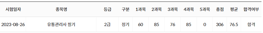 아무래도 직장인이고 어린아이가 집에 있다 보니 하루에 낼 수 있는 공부시간을 학생처럼 많이 내기는 어려웠습니다. 하지만 작년에 유통관리사 2급의 상위 자격증이라 불리는 물류관리사 자격증을 따 놓은 상황이었기 때문에, 어느 정도 자신감을 가지고 , 이론 없이 바로 기출문제를 돌리며, 약 "1달간" 독학으로 공부했고, 10회 이상의 기출을 풀어 평균 76.5점이라는 제 생각보다 고득점을 얻었습니다. (평균 60점 넘으면 자격증 취득)