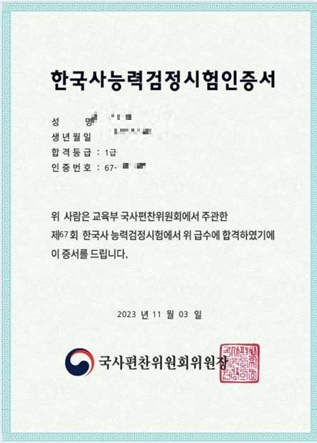 어려서 부터 역사에 관심이 많았고, 사극 등을 꽤나 좋아했었는데, 이번기회에 한능검 등급이 필요해 공부하게 되었는데, 1급을 목표로 공부했는데, 의외로 자격증시험에서 100점 맞은건 처음이라 굉장히 기분이 좋았습니다.