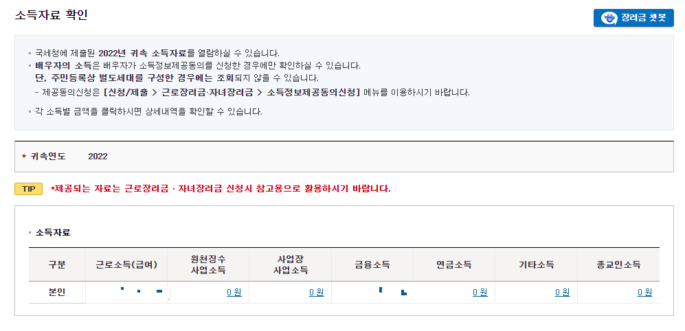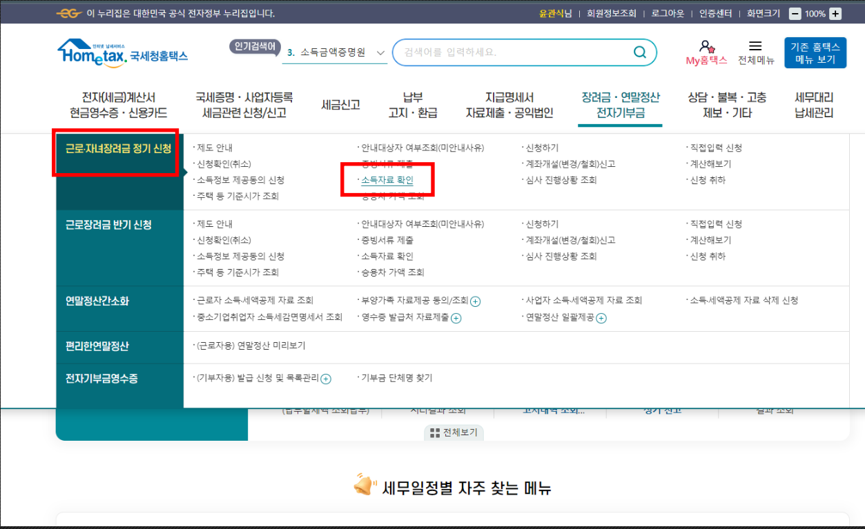 5. [근로 자녀장려금 정기신청] > [소득자료 확인] 클릭