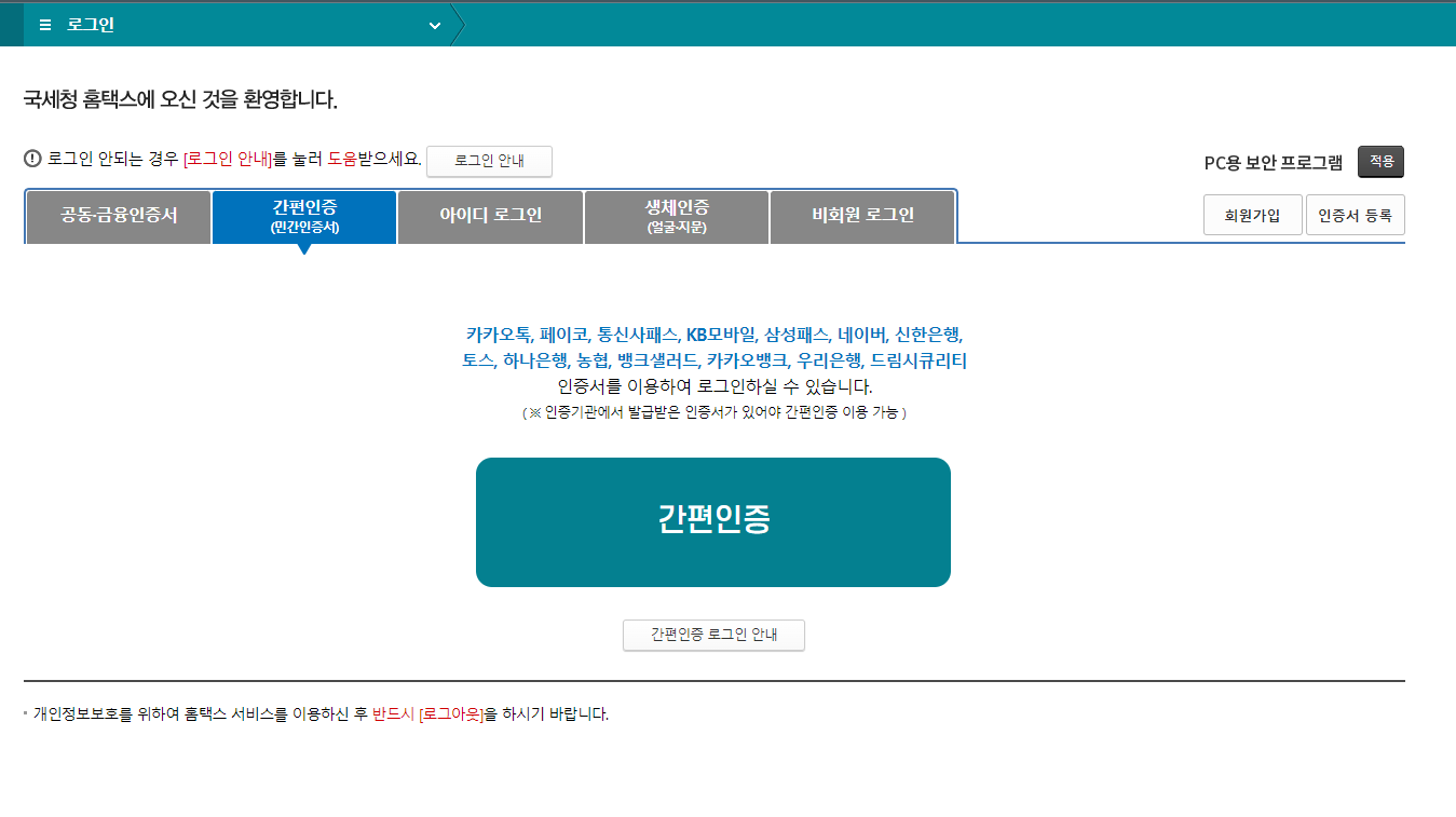 요즘은 홈택스도 로그인 방법이 다양해져서 , 편하신 걸 선택하셔서 로그인하시면 됩니다. 대부분 카카오톡 인증서나, 네이버 인증서 가지고 계실 텐데, 저는 이를 이용한 간편 인증을 추천해 드립니다.