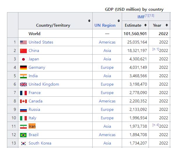 얼마전 위키피디아에서 GDP 를 살펴보다가 2022년 이란 GDP 가 우리나라보다도 높은걸 발견했습니다. 다른 인증되지 않은 기관도 아닌 IMF 에서 발표한 2022년 최신 자료 였습니다. 이란 GDP 순위가 한번도 우리나라 근방에도 없었는데, 갑자기 이란 GDP 가 우리나라보다 높다니,이게 어떻게 된거지 하고 의아해 했습니다.